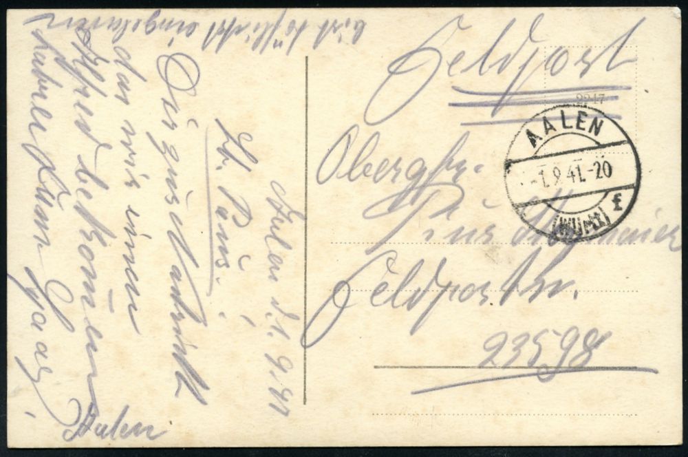 3744 | 12 € | POSTLEITRAUM 7000 (OHNE STUTTGART) : AALEN/ (Württ)/ f 1941 (1.9.) 1K-Brücke klar auf Feldpost-Foto-Ak. (Kinderportrait) an Fp.-Nr. 23598 = Ko Luft 12 | ![]() | |