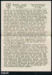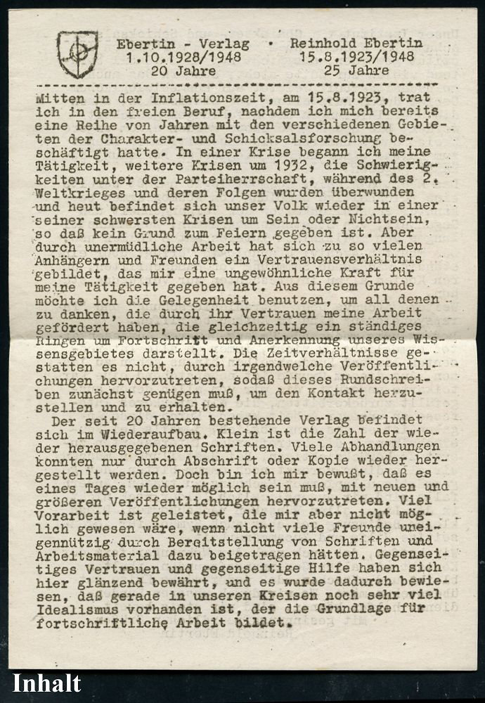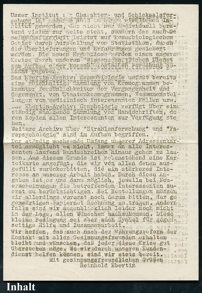 3746 | 15 € | POSTLEITRAUM 7000 (OHNE STUTTGART) : AALEN (Württ.)/ b/ Gebühr bezahlt 1948 (18.6.) PFS 1K-Brücke ohne Wertangabe u. Uhrzeit auf Reklame-Falrt-Bf.: Ebertin-Verlag (3 Seiten Text) = esoterischer Verlag (Dü.A-6, Nr.23) | ![]() ![]() ![]() | |