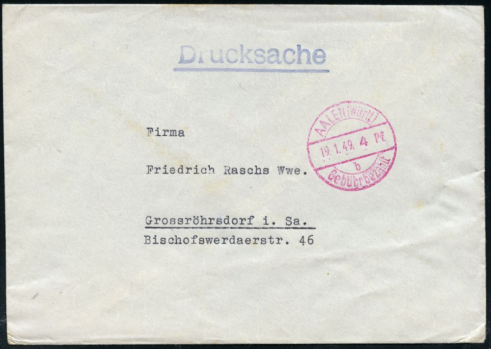 3747 | 10 € | POSTLEITRAUM 7000 (OHNE STUTTGART) : AALEN (Württ.)/ 4 Pf./ b/ Gebühr bezahlt 1949 (19.1.) PFS 1K-Brücke mit Wertangabe ohne Uhrzeit , klar gest. Inl.-Drs.-Bf. ohne Inhalt (Dü.A-6, Nr.25) | ![]() | |