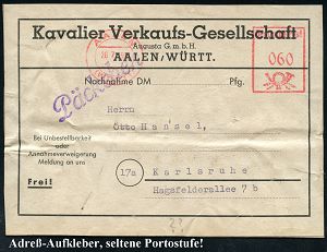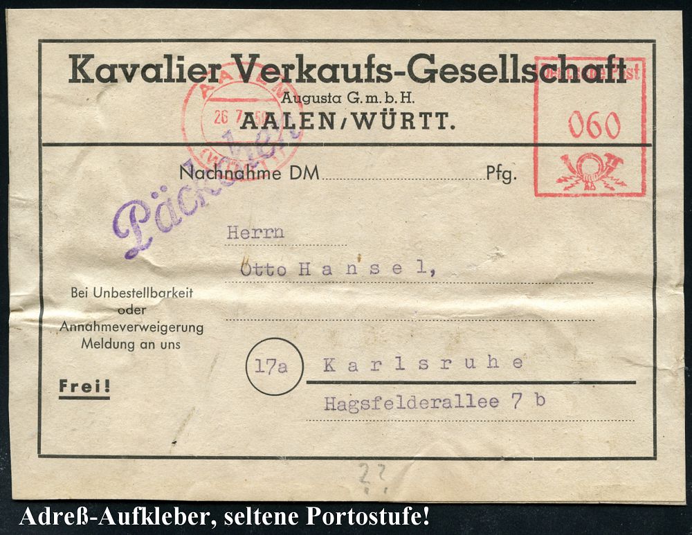 3749 | 18 € | POSTLEITRAUM 7000 (OHNE STUTTGART) : AALEN/ (WÜRTT)/ Deutsche Post 1950 (26.7.) AFS Francotyp "Posthorn" o h n e Werbeklischee 060 Pf. auf Päckchen-Adreß-Label: KavalierVerkaufs-Gesellschaft, Augusta gmbH.. mit Beförd.-Spuren (Dü.E-20CE ohne Abs.-Klischee) | ![]() | |