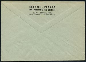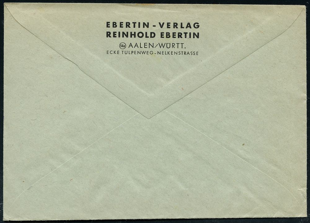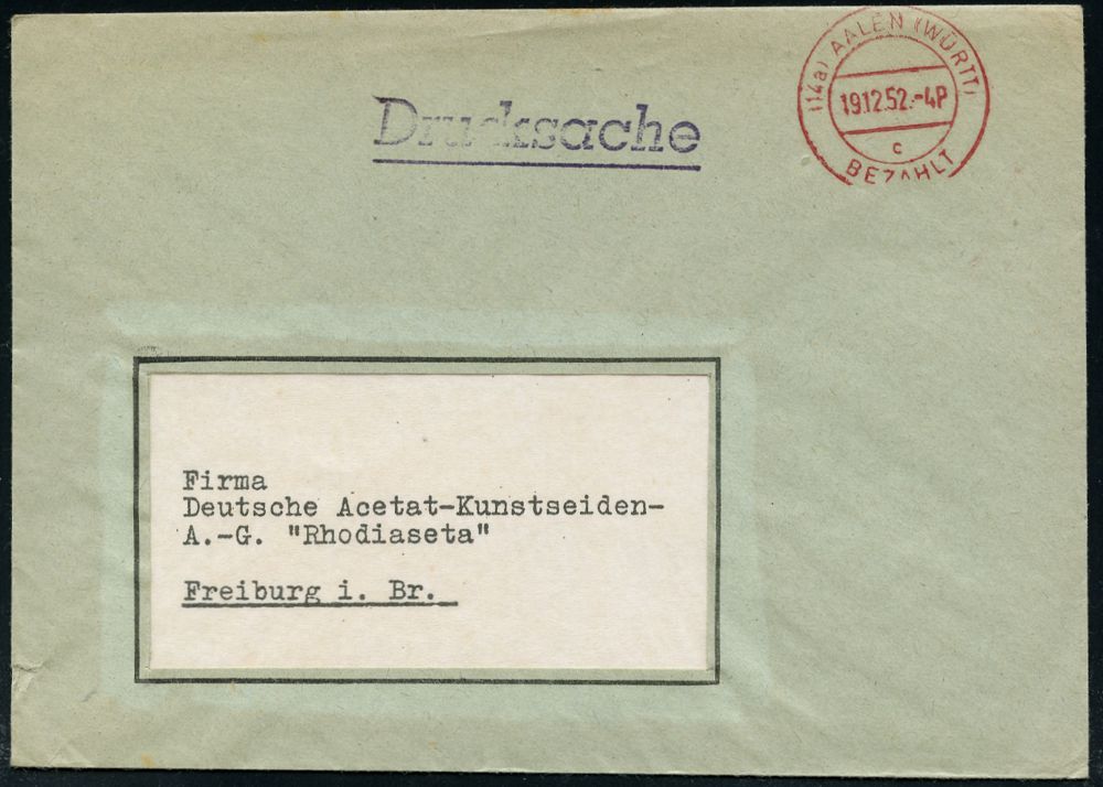 3750 | 8 € | POSTLEITRAUM 7000 (OHNE STUTTGART) : (14a) AALEN (WÜRTT)/ 4 P(f.)/ BEZAHLT 1952 (19.12.) PFS 2K-Steg auf Firmen-Drs., rs. Abs.: EBERTIN-VERLAG, REINHOLD EBERTIN.. (Dü.A-7, Nr.32) | ![]() ![]() | |
