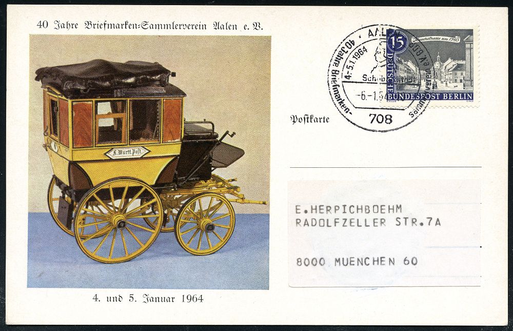 3751 | 15 € | POSTLEITRAUM 7000 (OHNE STUTTGART) : 708 AALEN/ 40 Jahre Briefmarken-Sammlerverein../ Schubartstadt 1964 (6.1.) SSt (Schubart-Brustbilld = Dichter, Komponist, Organist etc. 1739-91) Jubil.-Sonder-Kt. | ![]() | |