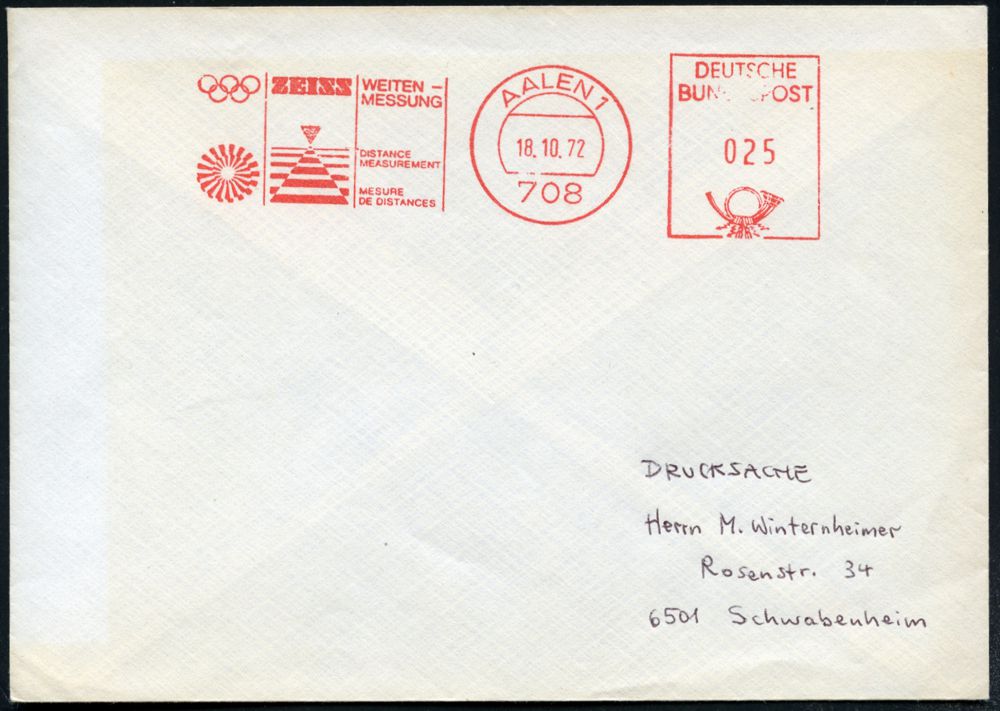 3752 | 12 € | POSTLEITRAUM 7000 (OHNE STUTTGART) : 708 AALEN 1/ ZEISS/ WEITEN-/ MESSUNG.. 1972 (18.10.) AFS Postalia (Olymp.Ringem Olympia-Spirale) Inl.-Bf. (Dü.E-26B) | ![]() | |
