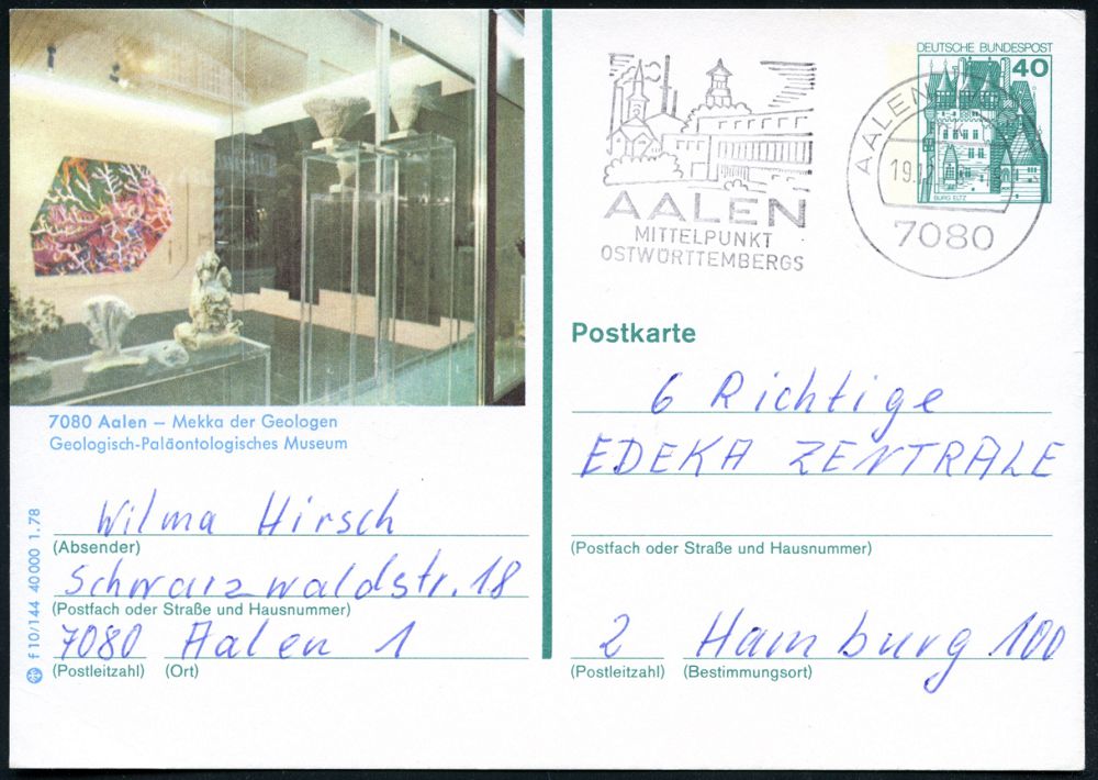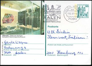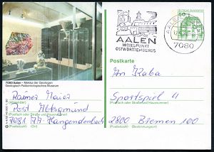 3754 | 12 € | POSTLEITRAUM 7000 (OHNE STUTTGART) : 7080 AALEN,WÜRTT/ mk/ MITTELPUNKT/ OSTWÜRTTEMBERGS 1981 (9.2.) MWSt auf BiP 50 Pf. Burge, blaugrün: Mekka der Geologen, Geolog.-Paläontolog. Museum , Bedarf!, seltene Kombination! (Mi.P 129/ g 2/21) | ![]() | |