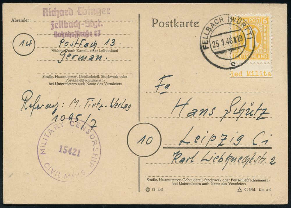 3796 | 15 € | POSTLEITRAUM 7000 (OHNE STUTTGART) : FELLBACH (WÜRTT)/ e 1946 (25.1.) 2K-Steg auf EF 6 Pf. AM-Post , Unterrandstück mit Randinschrift + viol. Zensur-1K: MILITARY CENSORSHIP/15421 (= Esslingen) Fern- Zensur-Kt. n.Leipzig (Mi.4 EF) | ![]() | |