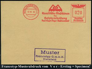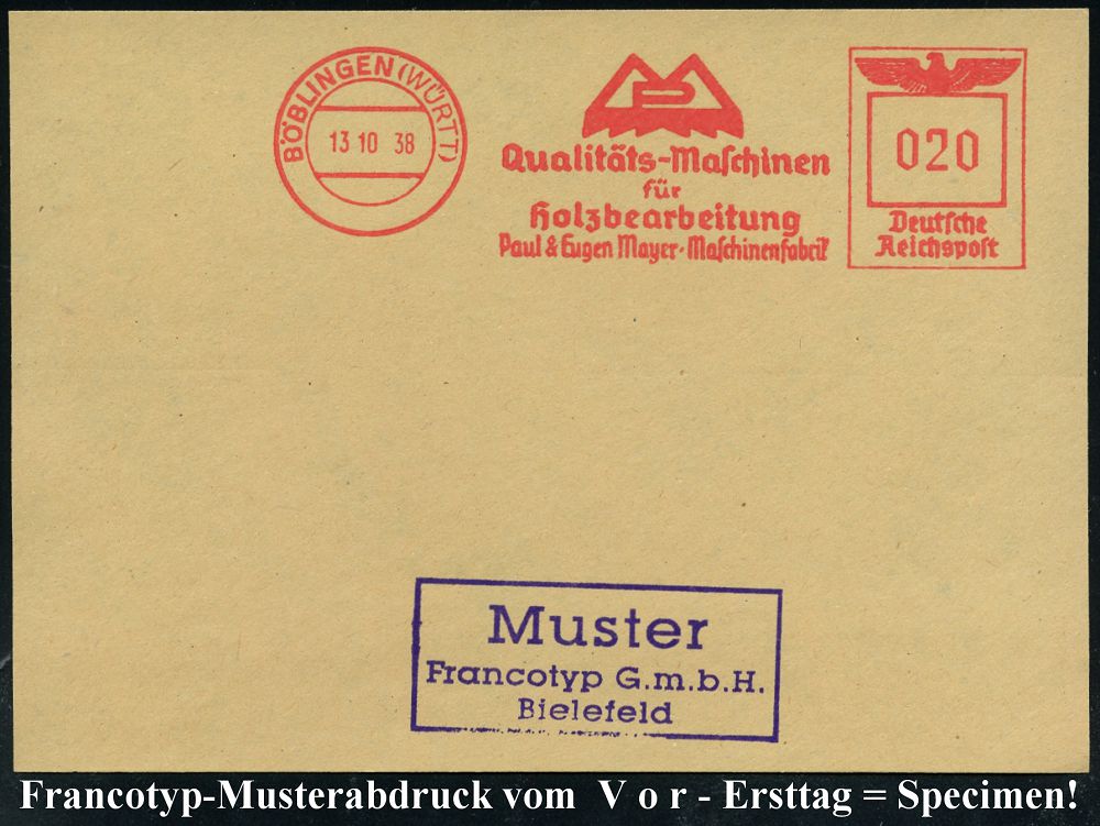 3762 | 35 € | POSTLEITRAUM 7000 (OHNE STUTTGART) : BÖBLINGEN (WÜRTT)/ Qualitäts-Maschinen/ für/ Holzbearbeitung/ Paul u.Eugen Mayer.. 1938 (13.10.) AFS-Musterabdruck Francotyp "Reichsadler" (Säge-Signet) glasklar gest. Francotyp-Musterblatt vom V o r - Ersttag! (mit Attest), selten! (Dü.E-5CGo) | ![]() ![]() | |
