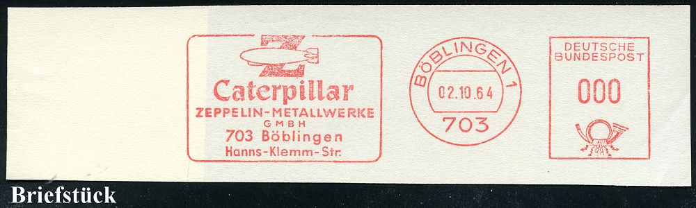 3765 | 8 € | POSTLEITRAUM 7000 (OHNE STUTTGART) : 703 BÖBLINGEN 1/ Caterpillar/ ZEPPELIN-METALLWERKE/ GMBH.. 1964 (2.10.) AFS Francotyp in 000 (Zeppelin-Logo) Briefstück (Dü.E-26) | ![]() | |