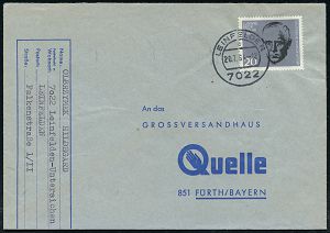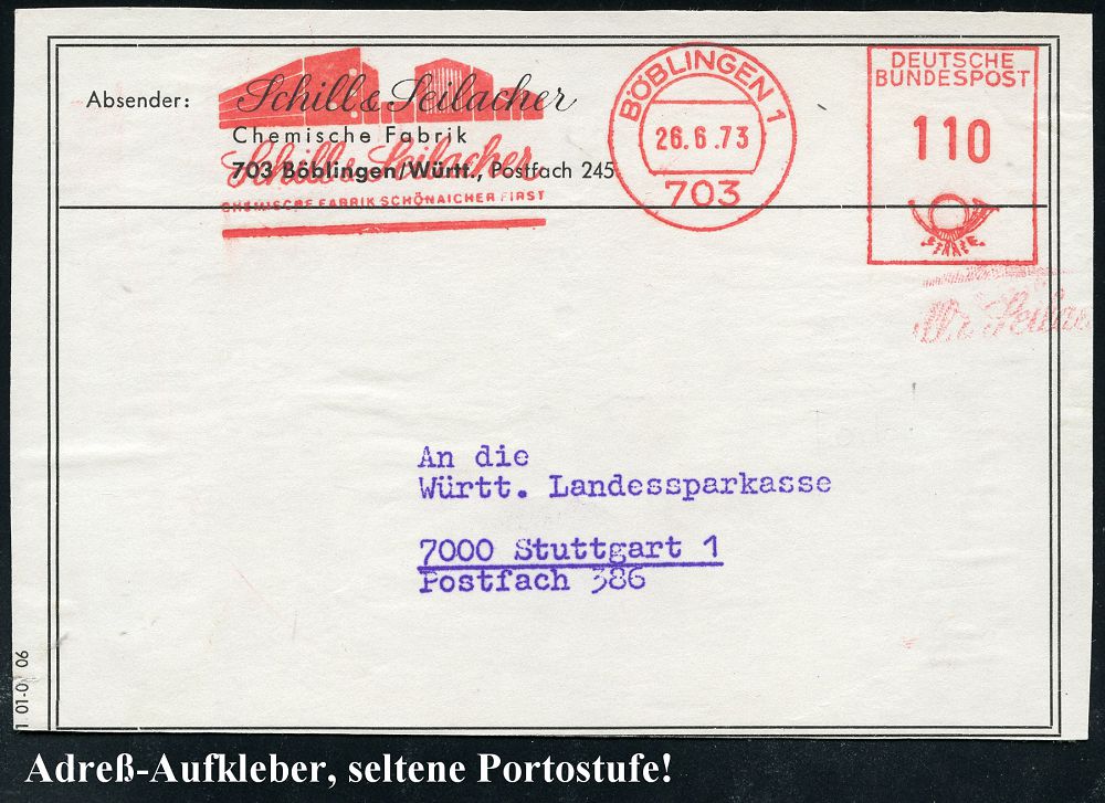 3766 | 18 € | POSTLEITRAUM 7000 (OHNE STUTTGART) : 7030 BÖBLINGEN 1/ Schill & Seilache/ CHEMISCHE FABRIK 1973 (26.6.) AFS Francotyp 110 Pf. auf Firmen-Adreß-Label, seltene Portostufe (Dü.E-26) | ![]() | |