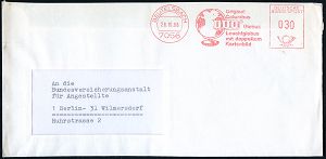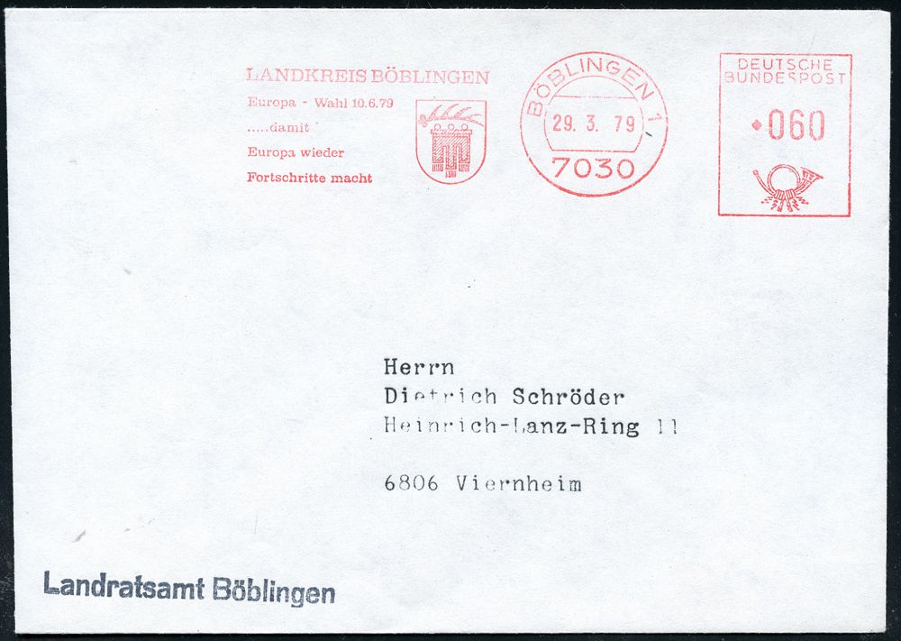 3767 | 10 € | POSTLEITRAUM 7000 (OHNE STUTTGART) : 7030 BÖBLINGEN 1/ LANDKREIS BÖBLINGEN/ Europa-Wahl 10.6.79.. 1979 (29.3.) AFS Francotyp (Stadtwappen) + Abs.-1L: Landratsamt Böblingen, Fern-Bf. (Dü.E-26, nur kurze Verwendungszeit) | ![]() | |