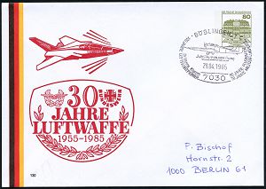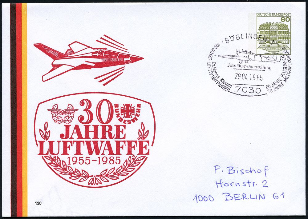3768 | 10 € | POSTLEITRAUM 7000 (OHNE STUTTGART) : 7030 BÖBLINGEN 1/ Jubiläumsausstellung/ Dr.Hanns Klemm/ 100 JAHRE LUFTFAHRTPIONIER.. 1985 (29.4.) SSt = Klemm-Flugzeug auf PU 80 Pf. Burgen: 30 JAHRE LUFTWAFFE 1955 - 1985 (Mi.PU 117/201) | ![]() | |