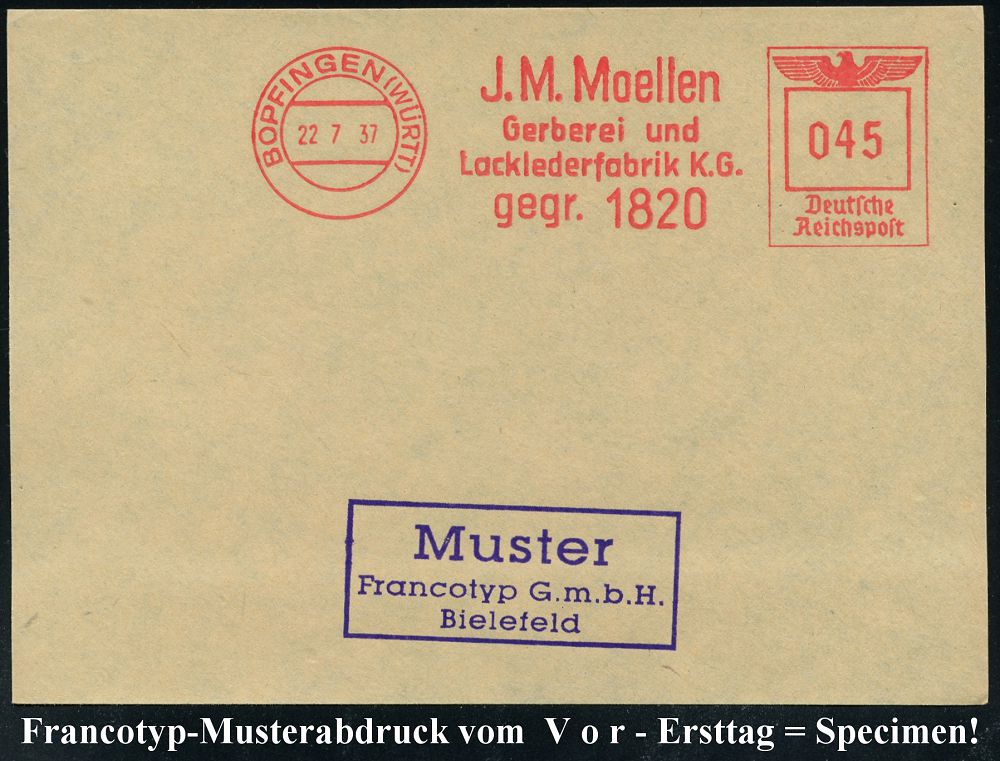 3770 | 35 € | POSTLEITRAUM 7000 (OHNE STUTTGART) : BOPFINGEN (WÜRTT)/ J.M.Moellen/ Gerberei u./ Lacklederfabrik K.G./ gegr.1820 1937 (22.7.) AFS-Musterabdruck "Reichsadler" , glasklar gest. Francotyp-Musterblatt vom V o r - Ersttag! (mit Attest), selten! (Dü.E-5CGo) | ![]() ![]() | |