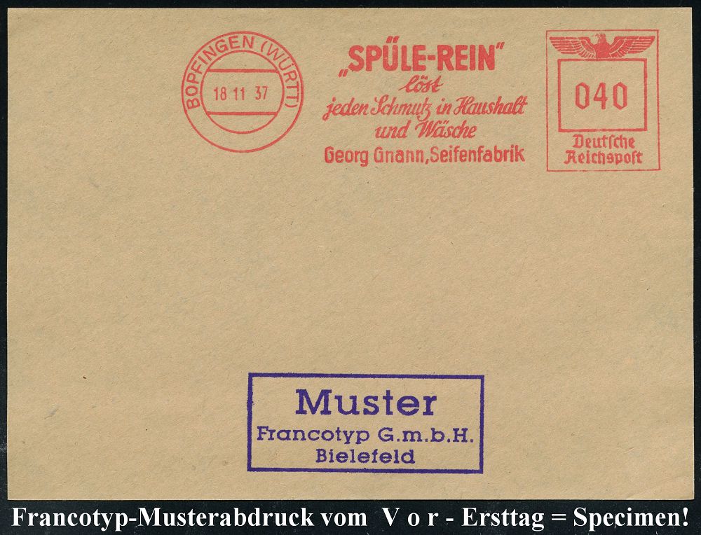 3771 | 35 € | POSTLEITRAUM 7000 (OHNE STUTTGART) : BOPFINGEN (WÜRTT)/ "SPÜLE-REIN"/ löst/ jeden Schmutz im Haushalt/ u.Wäsche/ Georg Gnann,Seifenfabrik 1937 (18.11.) AFS-Musterabdruck Francotyp "Reichsadler" , glasklar gest. Francotyp-Musterblatt vom V o r - Ersttag! (mit Attest), selten! (Dü.E-5CGo) | ![]() ![]() | |
