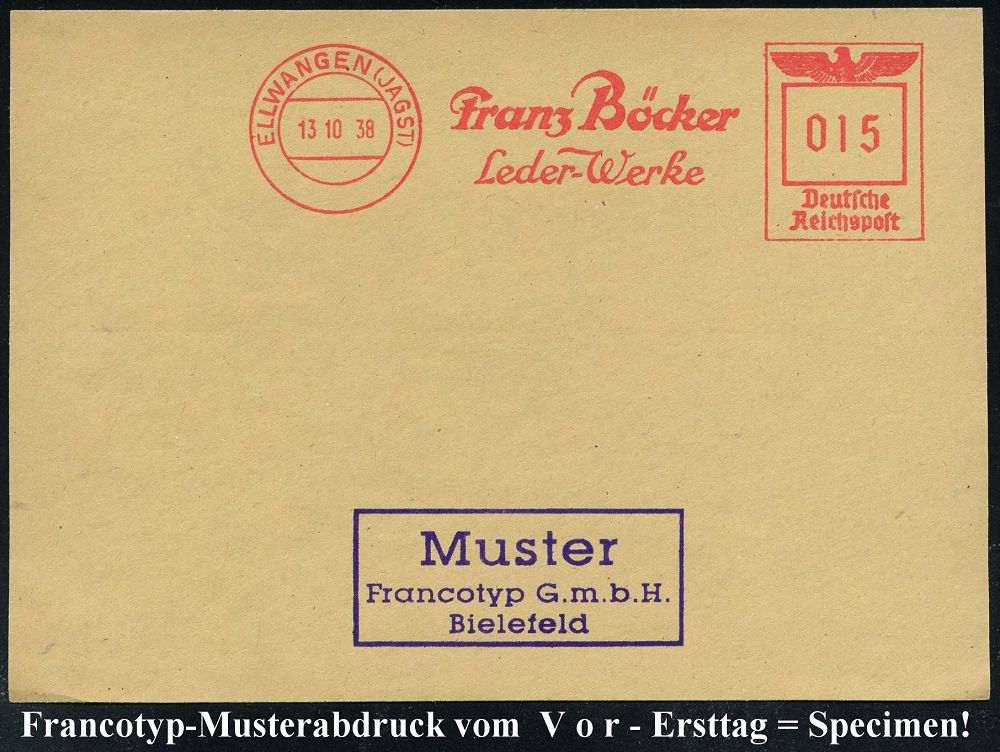 3777 | 35 € | POSTLEITRAUM 7000 (OHNE STUTTGART) : ELLWANGEN (JAGST)/ Franz Böcker/ Leder-Werke 1938 (13.10.) AFS-Musterabdruck Francotyp "Reichsadler" , glasklar gest. Francotyp-Musterblatt vom V o r - Ersttag! (mit Attest), selten! (Dü.E-5CGo) | ![]() ![]() | |