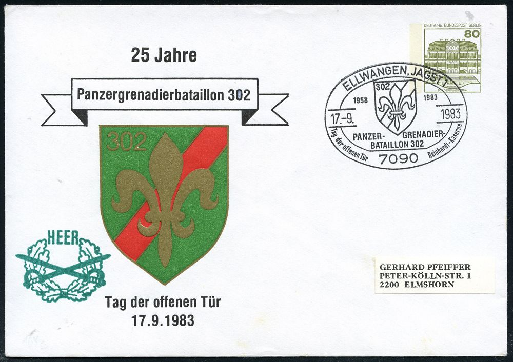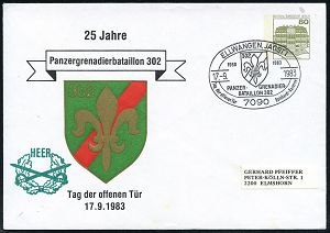 3783 | 10 € | POSTLEITRAUM 7000 (OHNE STUTTGART) : 7090 ELLWANGEN,JAGST 1/ 1958 1983/ PANZER-GRENADIER-/ Bataillon302.. 1983 (17.9.) SSt (Wappen) auf motivgl. PU 80 Pf. Burgen: 25 Jahre Panzergrenadierbataillon 302 (Mi.PU 117) | ![]() | |