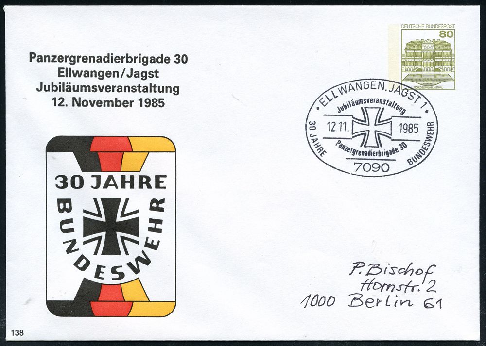 3784 | 10 € | POSTLEITRAUM 7000 (OHNE STUTTGART) : 7090 ELLWANGEN,JAGST 1/ Jubiläumsveranstaltung/ Panzergrendierbrigade 30.. 1985 (12.11.) SSt (Eisernes Kreuz) motivgl. PU 80 Pf. Burgen: Panzergrenadierbrigade 30.. (Mi.PU 117) | ![]() | |