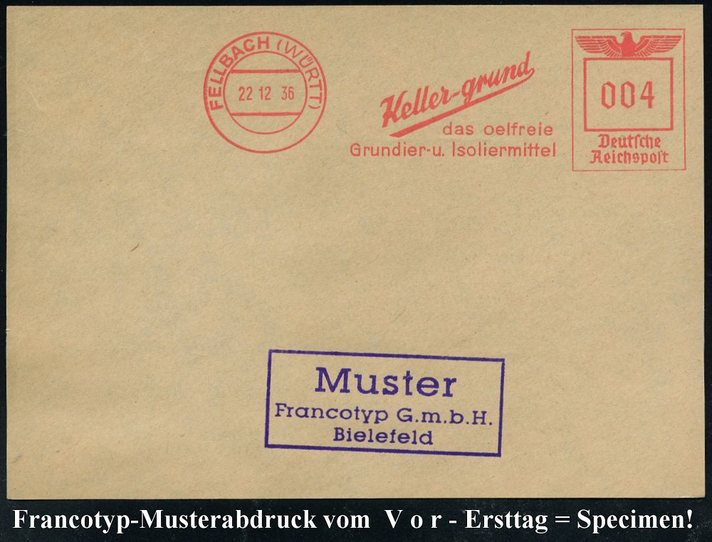 3792 | 35 € | POSTLEITRAUM 7000 (OHNE STUTTGART) : FELLBACH (WÜRTT)/ Keller-grund/ das oelfreie/ Grundier-u.Isoliermittel 1936 (22.12.) AFS-Musterabdruck Francotyp "Reichsadler" , glasklar gest. Francotyp-Musterblattt vom V o r - Ersttag! (mit Attest), selten! (Dü.E-5CGo) | ![]() ![]() | |