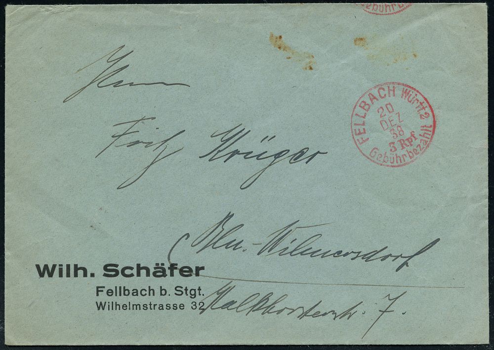 3794 | 14 € | POSTLEITRAUM 7000 (OHNE STUTTGART) : FELLBACH Württ. 2/ 3 Rpf./ Gebühr bezahlt 1938 (20.12.) roter 1K-PFS auf Firmen-Bf.: Wilh. Schäfer.. (Dü.A-4, Nr.13 a) | ![]() | |