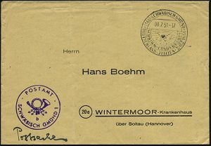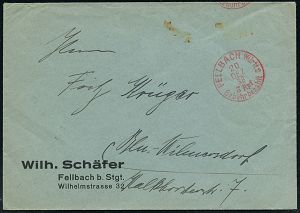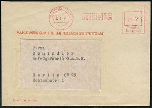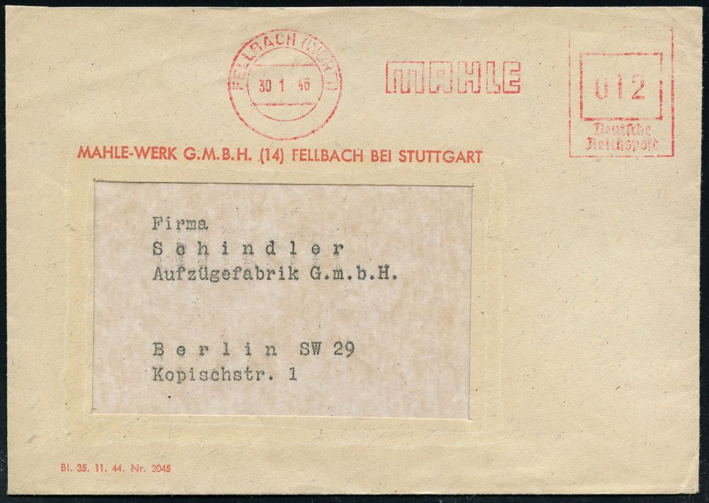 3797 | 22 € | POSTLEITRAUM 7000 (OHNE STUTTGART) : FELLBACH (WÜRTT)/ MAHLE 1946 (30.1.) aptierter AFS Francotyp "Reichsadler" = entfernt + Inschrift "Deutsche Reichspost" , Firmen-Fern-Bf.: MAHLE-WERK GMBH.. = Kolben-Hersteller, Autozulieferer n. Berlin (Dü.E-13AK-129o) | ![]() | |