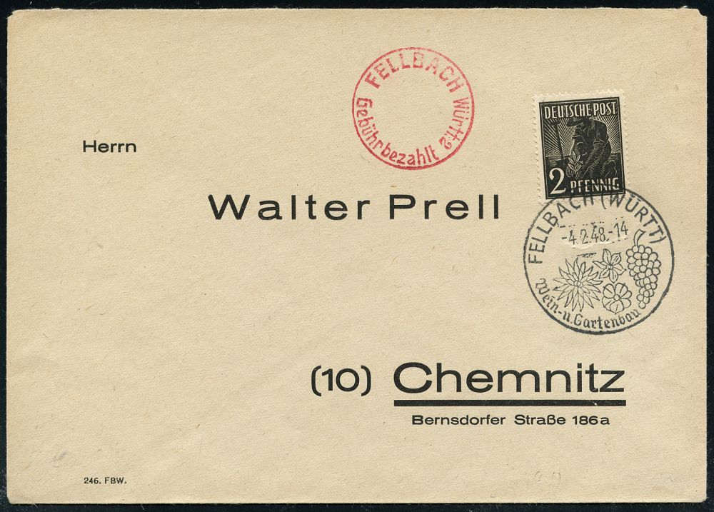 3798 | 25 € | POSTLEITRAUM 7000 (OHNE STUTTGART) : FELLBACH (WÜRTT)/ Wein-u.Gartenstadt 1948 (4.2.) HWSt (Blumen, Weintraube) auf EF 2 Pf. Arbeiter + roter PFS: FELLBACH Württ. 2/ Gebühr bezahlt o h n e Datum , seltene Teil-Barfrankatur auf Fern-Bf. in die SBZ (Bo.2) | ![]() | |