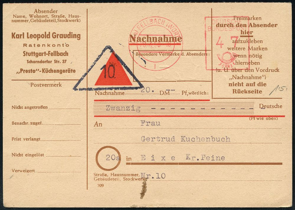 3799 | 14 € | POSTLEITRAUM 7000 (OHNE STUTTGART) : (14a) FELLBACH (WÜRTT)/ l/ DEUTSCHE/ BUNDESPOST 1958 (20.4.) PFS "Posthorn" 47 Pf. auf NN-Firmen-Kt.: Karl Leopold Grauding.. "Presto"-Küchengeräte + schw. NN-Dreieckstempel, seltene Portostufe! (Dü.D-17) | ![]() | |