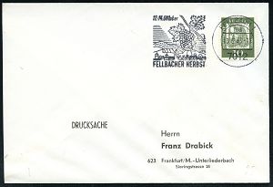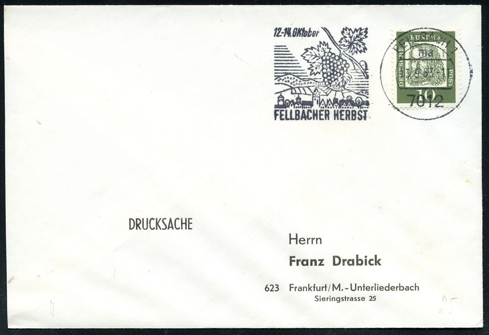 3801 | 9 € | POSTLEITRAUM 7000 (OHNE STUTTGART) : 7012 FELLBACH 1/ ma/ 12.-14.Okt./ FELLBACHER HERBST 1963 (13.9.) MWSt (Landschaft mit Weintraube) klar gest. kleiner Inl.-Bf. (Bo.25 A) | ![]() | |