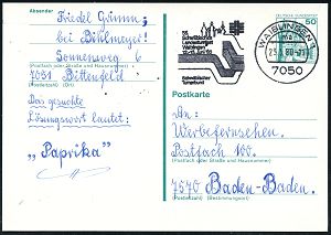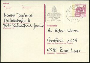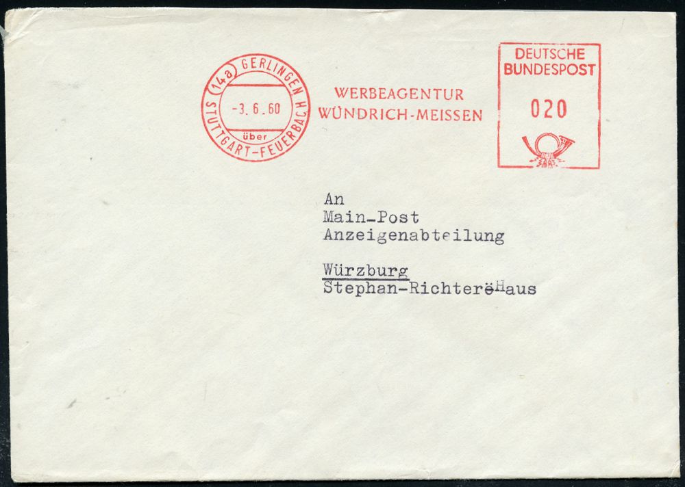 3808 | 12 € | POSTLEITRAUM 7000 (OHNE STUTTGART) : (14a) GERLINGEN/ über/ STUTTGART-FEUERBACH/ WERBEAGENTUR/ WÜNDRICH-MEISSEN 1960 (3.6.) AFS Postalia = PSt.I-Typ , rs. Abs.-Vordruck, Fern-Bf. | ![]() | |