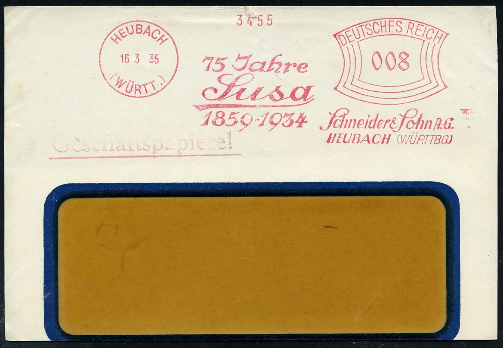 3812 | 14 € | POSTLEITRAUM 7000 (OHNE STUTTGART) : HEUBACH/ (WÜRTT.)/ 75 Jahre/ Susa/ 1859-1934/ Schneider & Sohn AG.. 1935 (16.3.) Jubil.-AFS Francotyp "Bogenrechteck" auf Teil-Vorderseite (gr. Briefstück) vergl. Kat. Nr.3010 | ![]() | |
