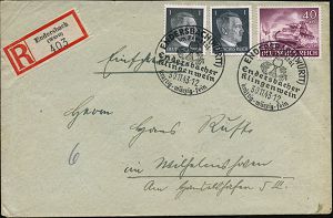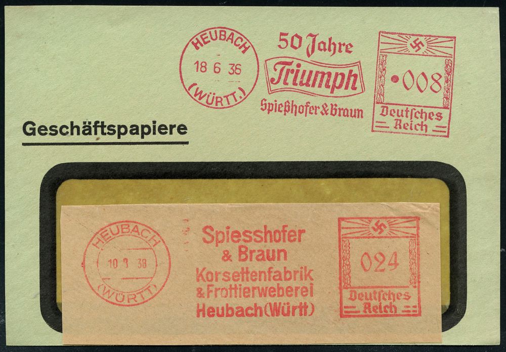 3813 | 20 € | POSTLEITRAUM 7000 (OHNE STUTTGART) : HEUBACH/ (WÜRTT.)/ 50 Jahre/ Triumph/ Spießhofer 6 Braun #bzw.# Spiesshofer & Braun/ Korsettfabrik/ & Frottierwebereien 1936/38 2 verschiedene AFS Francotyp "Hakenkreuz" auf Vorderseite bzw. Briefstück, 2 Belege (Dü.E-3Ao) | ![]() | |