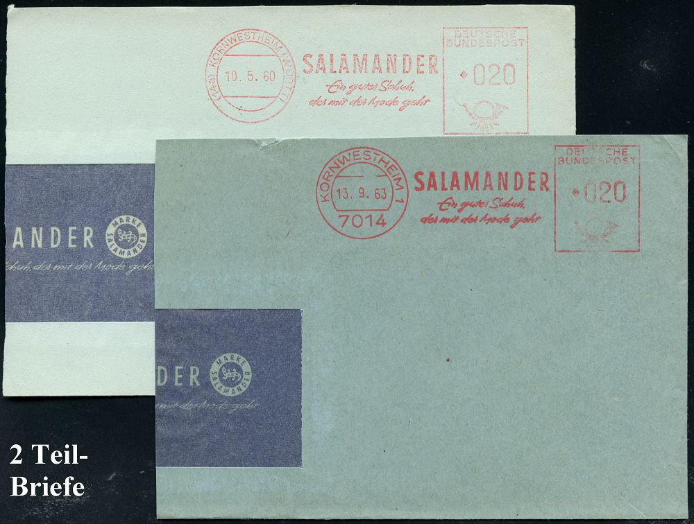 3820 | 18 € | POSTLEITRAUM 7000 (OHNE STUTTGART) : (14a) #bzw.# 7014 KORNWESTHEIM 1/ SALAMANDER/ Ein guter Schuh.. 1960/63 2 verschiedene AFS Francotyp mit alter und neuer PLZ , je auf Reklame-Teil-Bf. mit Samamander-Logo, 2 Belege (Dü,E.23D) | ![]() | |