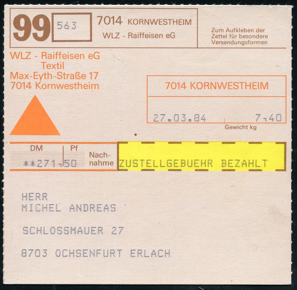 3824 | 14 € | POSTLEITRAUM 7000 (OHNE STUTTGART) : 7014 KORNWESTHEIM 1984 (27.3.) EDV-Freistempel ohne Posthorn, 7,40 + Zusatz: ZUSTELLGEBÜHR BEZAHLT (DM) auf Inl.-NN-PSelbstbucher-Paketkt.: 7014 KORNWESTHEIM/ WLZ - Raiffeisen eG (Textil), seltene Portostufe! | ![]() | |