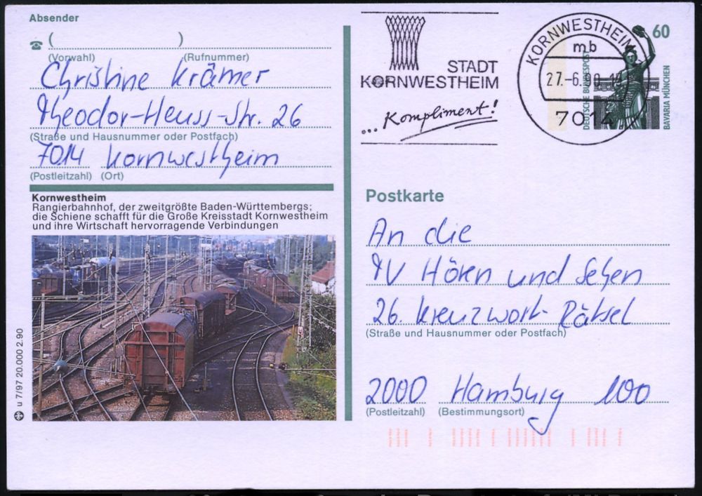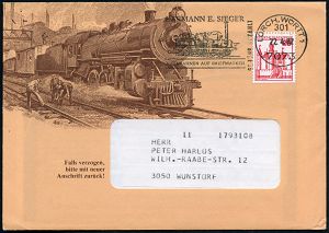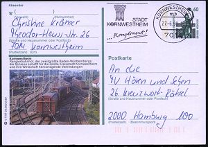 3825 | 12 € | POSTLEITRAUM 7000 (OHNE STUTTGART) : 7014 KORNWESTHEIM 1/ mb/ STADT/ KORNWESTHEIM/ ...Kompliment! 1990 (28.6.) MWSt (Gleise) auf orts- u. motiv-ähnl. BiP 60 Pf. Bavaria: Kornwestheim Ragierbahnhof.. (mit Güterwaggons), Bedarf, seltene Kombinatio! (Mi.P 139) | ![]() | |