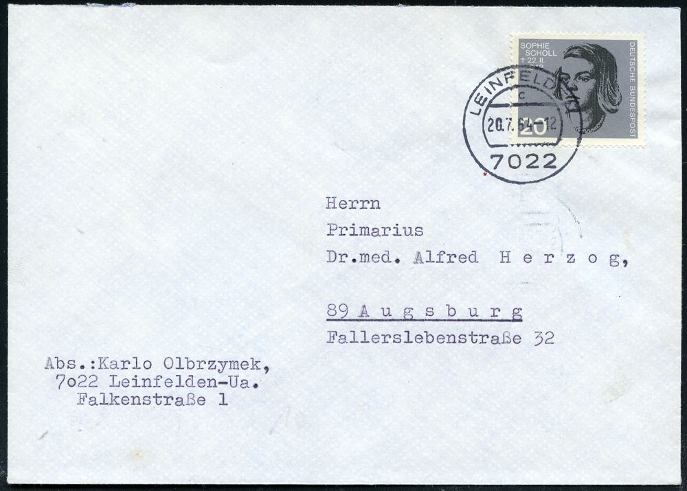 3827 | 15 € | POSTLEITRAUM 7000 (OHNE STUTTGART) : 7022 LEINFELDEN/ c 1964 (20.7.) 1K-Segent auf EF 20 Pf. Sophie Scholl (NS-Widerstandskämpferin) klar gest., seltener Bedarfs-FDC, 20.7. = Tag des Stauffenberg-Attentats auf Hitler (Mi.431 EF + 25.- EUR) | ![]() | |