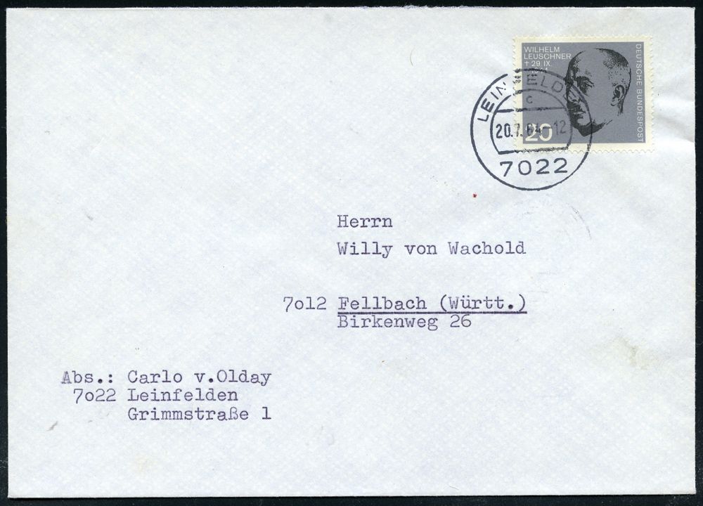 3829 | 15 € | POSTLEITRAUM 7000 (OHNE STUTTGART) : 7022 LEINFELDEN/ c 1964 (20.7.) 1K-Segment auf EF 20 Pf. Wilhelm Leuschner (= NS-Widerstandskämpfer, Gewerkschaftler) klar gest., seltener Bedarfs-FDC 20.7. = Tag des Stauffenberg-Attentats auf Hitler (Mi.436 EF + 25.- EUR) | ![]() | |