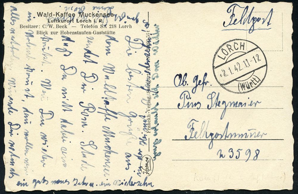 3835 | 18 € | POSTLEITRAUM 7000 (OHNE STUTTGART) : LORCH/ (Württ) 1942 (2.1.) 1K-Brücke auf Feldpost-Foto-Ak.: Wald-Kafee Muckensee.. (terrasse) an Feldpost-Nr. 23598 = KoLuft Luft-Aufklärer | ![]() ![]() | |