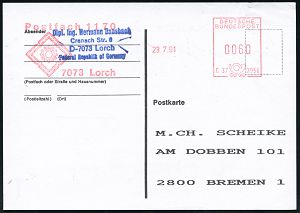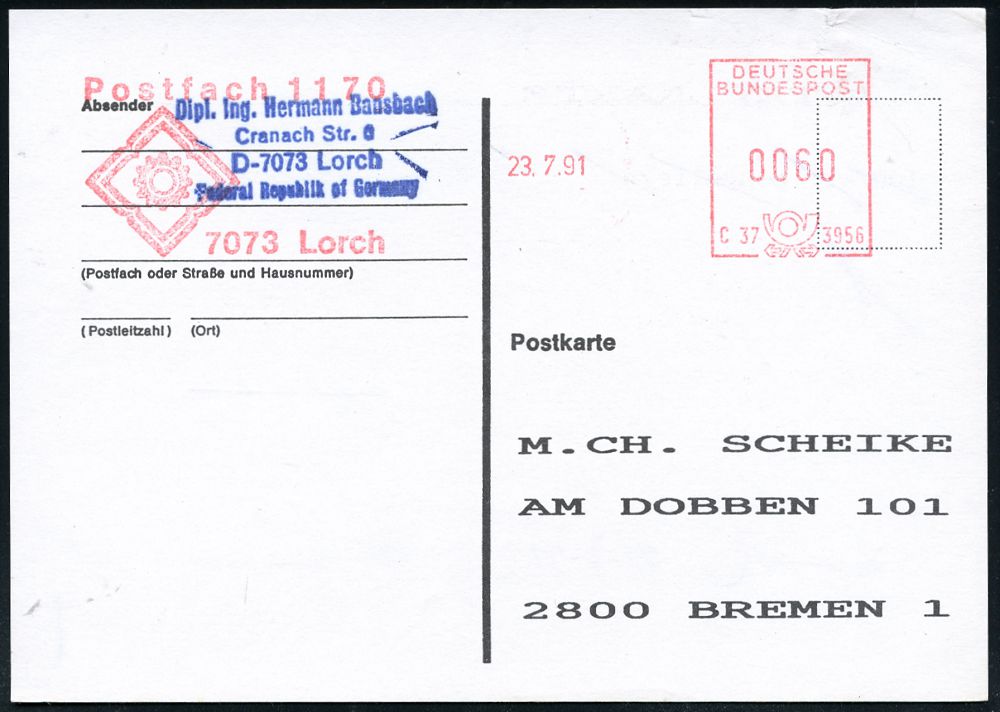 3841 | 15 € | POSTLEITRAUM 7000 (OHNE STUTTGART) : Lorch 199 (23.7.) AFS Francotyp mit Kennung u. stilis. Posthorn o h n e Ortsstempel: Postfach 1170/ 7073 Lorch, nur Datum! (Firmen-Logo) Fernkarte, Abs. Dipl.-Ing. Hermann Bansbach.., Bedarf | ![]() | |