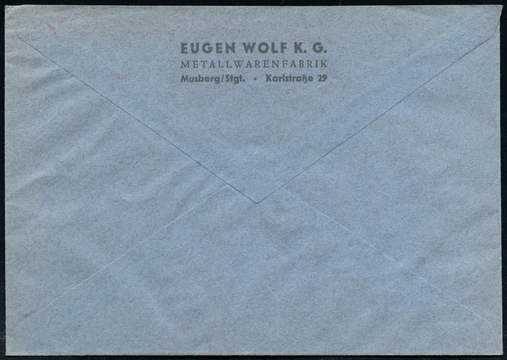 3842 | 15 € | POSTLEITRAUM 7000 (OHNE STUTTGART) : (14a) MURBERG/ über/ STUTTGART-VAIHNGEN/ W/ STAHLSCHRÄNKE/ ..HEIZÖLTANKS/ ÖL-U.SCHMIERGERÄTE 1960 (9.6.) AFS Francotyp PSt.I-Typ (Tankbehälter, Monogr. mit Wolf) Fern-Bf., rs. Abs.-Vordruck: EUGEN WOLF KG.. (Dü.E-20CO) | ![]() ![]() | |
