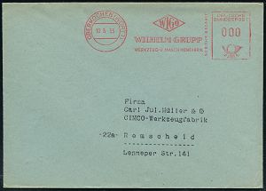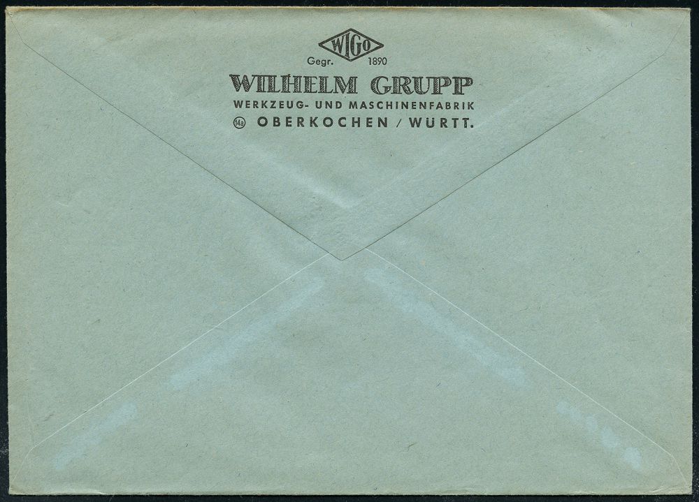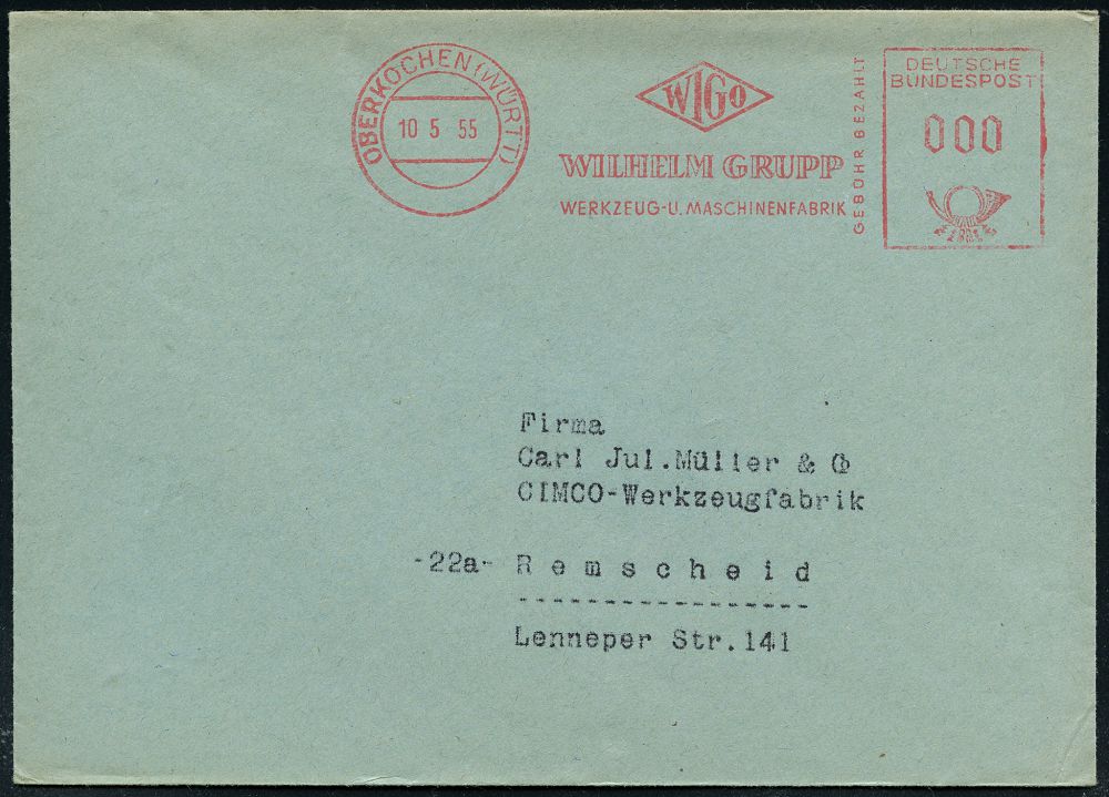 3843 | 12 € | POSTLEITRAUM 7000 (OHNE STUTTGART) : OBERKOCHEN (WÜRTT)/ GEBÜHR BEZAHLTWIGO/ WILHELM GRUPP/ WERKZEUG-u.MASCHINANFABRIK 1955 (10.5.) AFS Francotyp in 000 = Massen-Drs. (Firmen-Monogr.) rs. motivgl. Abs.-Vordruck, Fern-Bf. (Dü.E-23CG) | ![]() ![]() | |