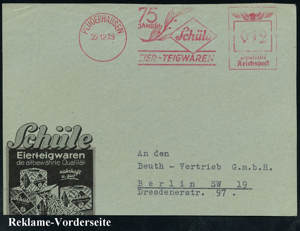 3846 | 18 € | POSTLEITRAUM 7000 (OHNE STUTTGART) : PLÜDERHAUSEN/ 75 JAHRE/ Schüle/ EIER-TEIGWAREN 1939 (22.12.) Jubil.-AFS Francotyp "Reichsadler" (Lorbeer) auf Reklame-Vorderseite: Schüle-Eierteigwaren (Dü.E-5BAo) | ![]() | |