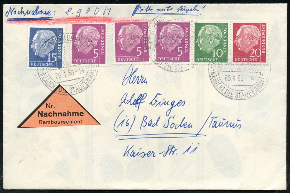 3847 | 16 € | POSTLEITRAUM 7000 (OHNE STUTTGART) : (14a) PLÜDERHAUSEN (WÜRTT)/ BESUCHT DIE STAUFFENHALLE 1960 (26.4.) HWSt 3x (teils etw. undeutl.) auf 4-Farben-Frankatur Heuss 60 Pf. auf Fern-NN-Bf. | ![]() | |