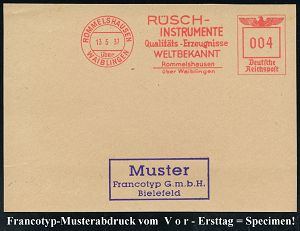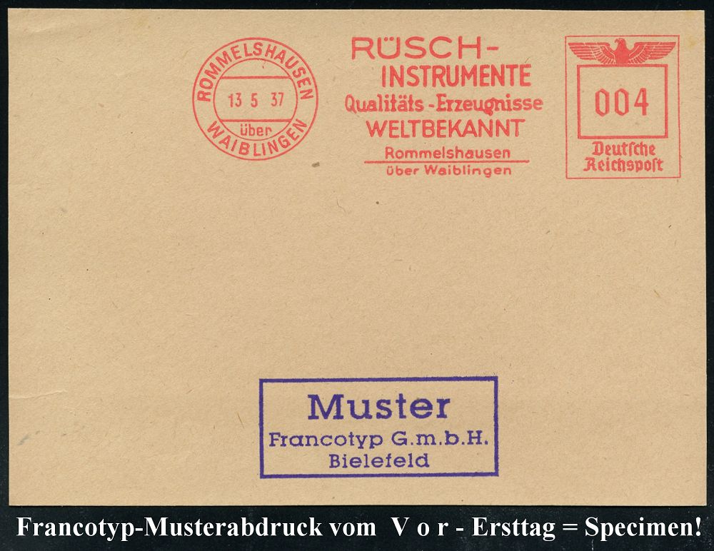 3848 | 35 € | POSTLEITRAUM 7000 (OHNE STUTTGART) : ROMMELSHAUSEN/ über/ WAIBLINGEN/ RÜSCH-/ INSTRUMENTE.. 1937 (13.5.) AFS-Musterabdruck Francotyp "Reichsadler" = PSt.I-Typ , glasklar gest. Francotyp-Musterblatt vom V o r - Ersttag! (mit Attest), selten! (Dü.E-5CGo) | ![]() ![]() | |