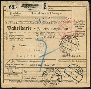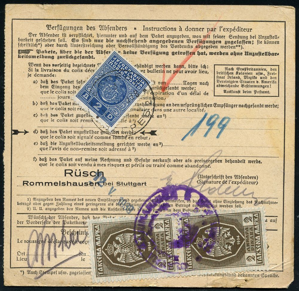 3849 | 28 € | POSTLEITRAUM 7000 (OHNE STUTTGART) : Rommelshausen/ über Waiblingen/ R ü s c h 1939 (5.5.) schw. Selbstbucher-Paketzettel (Fleckchen)+ roter Doppeloval-PFS: WAIBLINGEN/Gebühr bezahlt , klar gest. Ausl.-Selbstbucher-Paketkarte n. Zagreb, rs. jugoslaw. Tax- u. Fiskalmarken (Dü.A-5, Nr.20) | ![]() ![]() | |