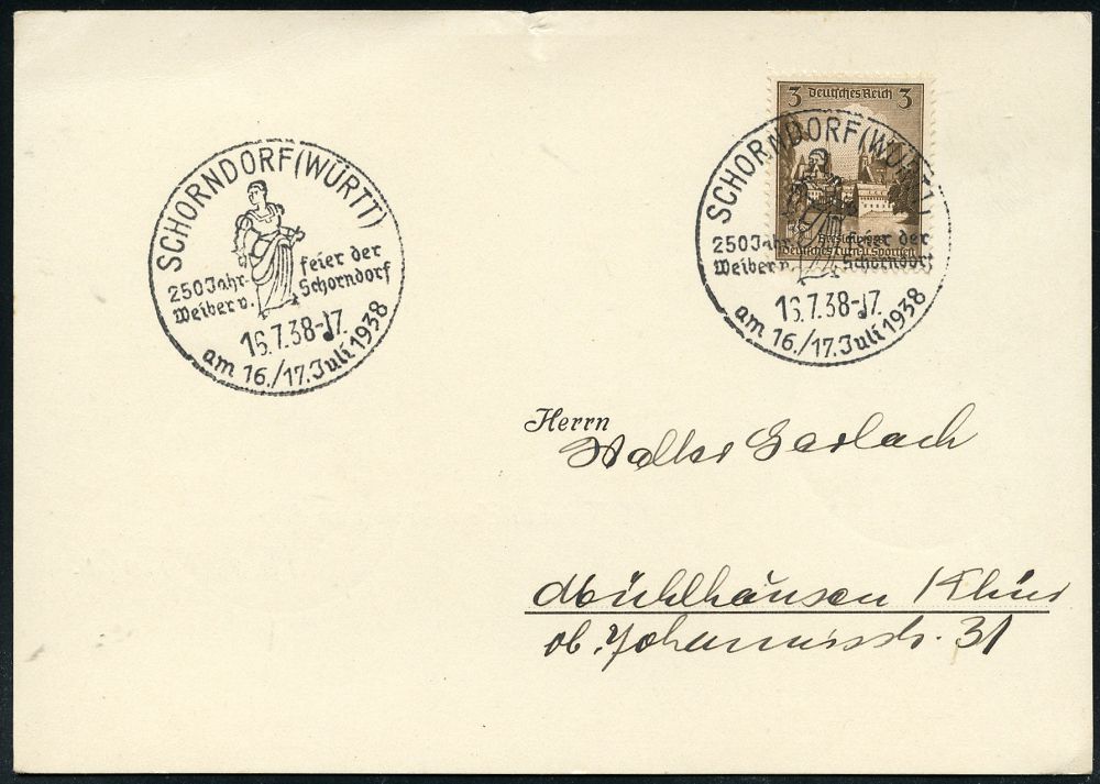3860 | 18 € | POSTLEITRAUM 7000 (OHNE STUTTGART) : SCHORNDORF (WÜRTT)/ 250 Jahrfeier der/ Weiber von Schorndorf 1938 (19.7.) HWSt = Frau Bürgermeister Walch , klar gest. Inl.-Karte (Bo.8, nur einige Monate 1938 verwendet) | ![]() | |