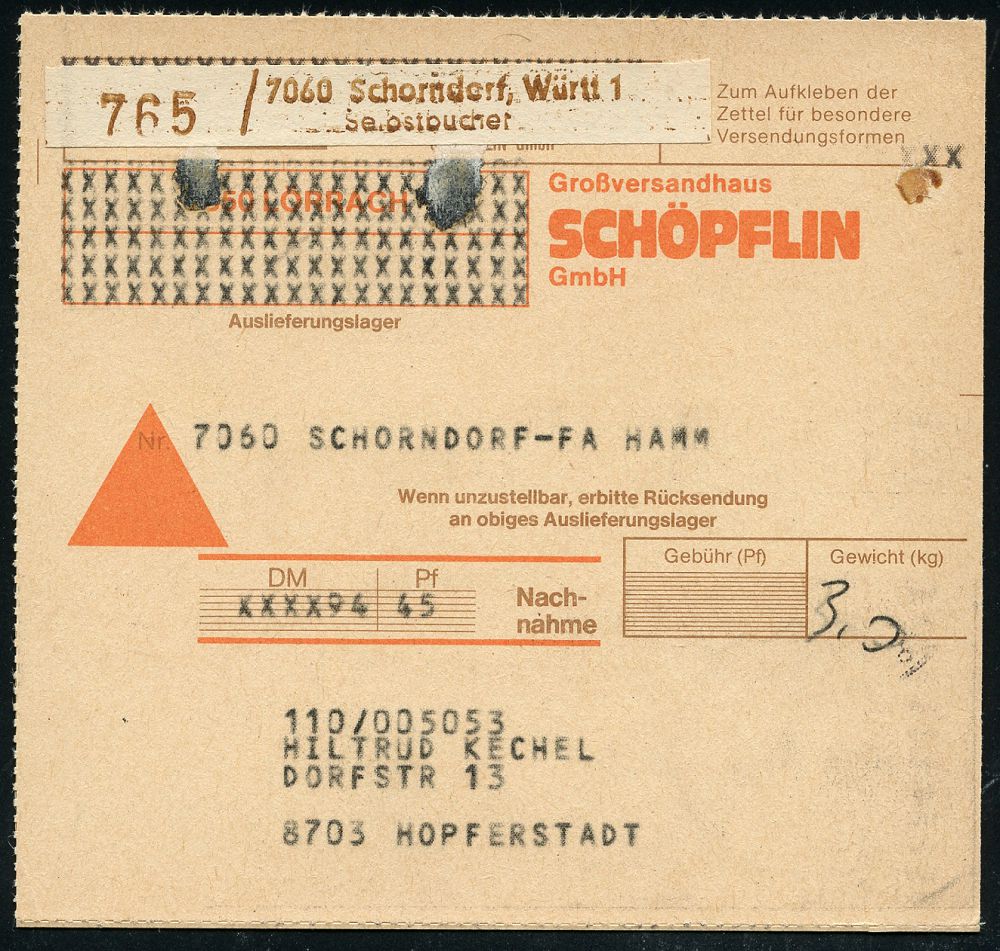 3867 | 8 € | POSTLEITRAUM 7000 (OHNE STUTTGART) : 7060 Schorndorf, Württ 1/ Selbstbucher 1980 brauner Selbstbucher-Paketzettel auf NN-Selbstbucher-Paketkt.: Großversandhaus SCHÖPFLIN GmbH | ![]() | |