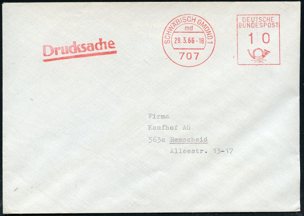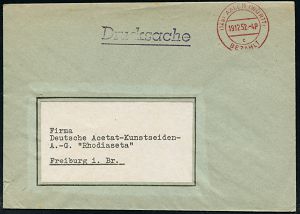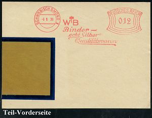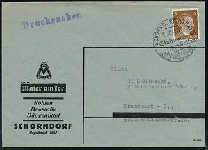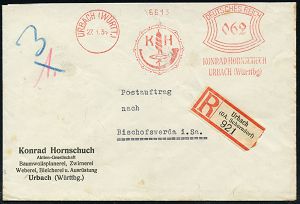3908 | 25 € | POSTLEITRAUM 7000 (OHNE STUTTGART) : URBACH (WÜRTT.)/ KONRAD HORNSCHUH 1934 (27.1.) AFS Francotyp "Bogenrechteck" 062 Pf. (Logo: Spinnrocken, Weberschiffchen, Horn) + RZ: Urbach/ (O. A. Schorndorf) (rechts nicht ganz voll), Postauftrags-R-Bf., seltenes Porto! (Dü.E-1BAh) | ![]() | |