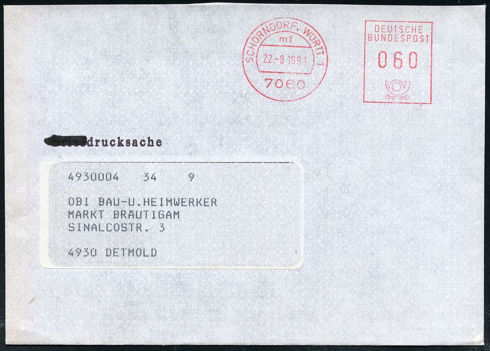 3873 | 5 € | POSTLEITRAUM 7000 (OHNE STUTTGART) : 7060 SCHORNDORF,WÜRTT 1/ mf/ DEUTSCHE/ BUNDESPOST 1991 (22.8.) Post-FS stilisiertes Posthorn 060 Pf. ohne Uhrzeit, Jahreszahl vierstellig auf Inl.-Drs.-Bf. (Dü.D-17 neues Posthorn) | ![]() | |