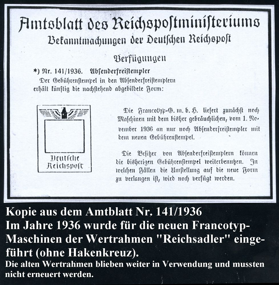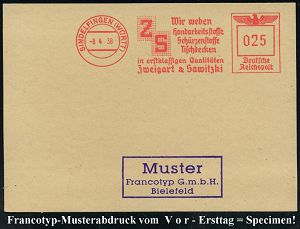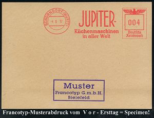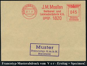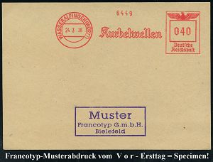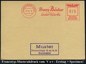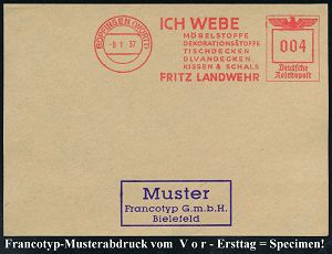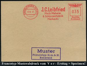 3886 | 35 € | POSTLEITRAUM 7000 (OHNE STUTTGART) : SINDELFINGEN (WÜRTT)/ J.C.Leibfried/ Mech.Weberei/ & Schürzenfabrik.. 1937 (6.12.) AFS-Musterabdruck Francotyp "Reichsadler" , glasklar gest. Francotyp-Musterblatt vom V o r - Ersttag! (mit Attest), selten! (Dü.E-5CGo) | ![]() ![]() | |