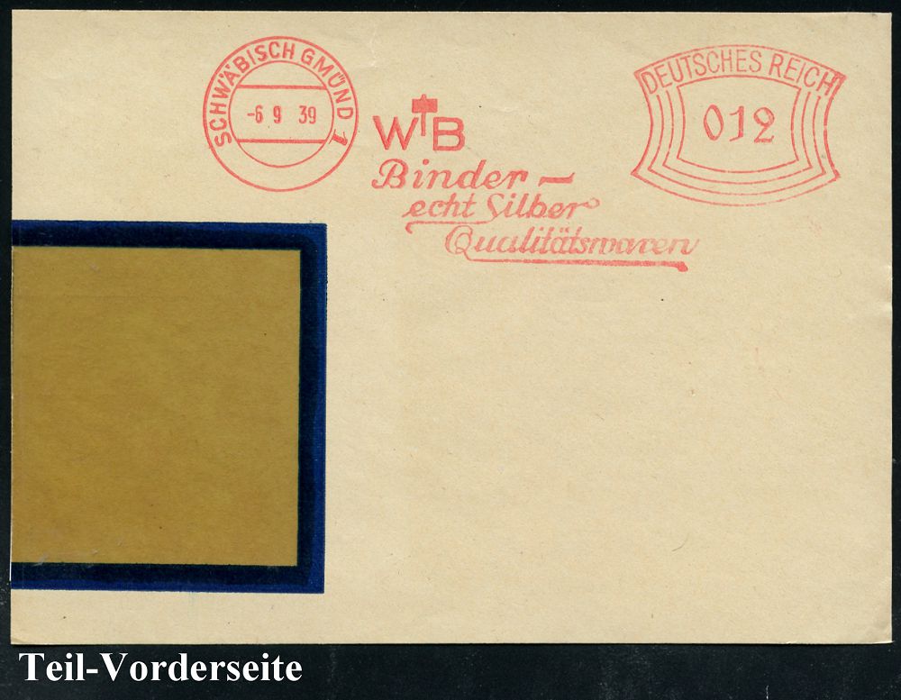 3879 | 12 € | POSTLEITRAUM 7000 (OHNE STUTTGART) : SCHWÄBISCH GMÜND 1/ WB/ Binder-/ echt Silber/ Qualitätswaren 1939 (6.9.) AFS Francotyp "Bogenrechteck" , klar gest. Teil-Vorderseite (Dü.E-1CEo) | ![]() | |