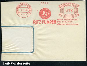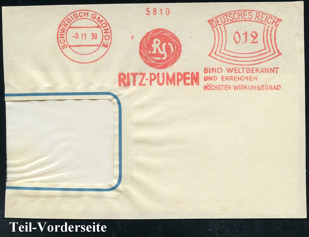 3880 | 12 € | POSTLEITRAUM 7000 (OHNE STUTTGART) : SCHWÄBISCH GMÜND 1/ RP/ RITZ-PUMPEN/ SIND WELTBEKANNT.. 1939 (8.11.) AFS Francotyp "Bogenrechteck" (Firmenlogo mit Wasserpumpe) klar gest. Teil-Vorderseite (Dü.E-1CEh) | ![]() | |