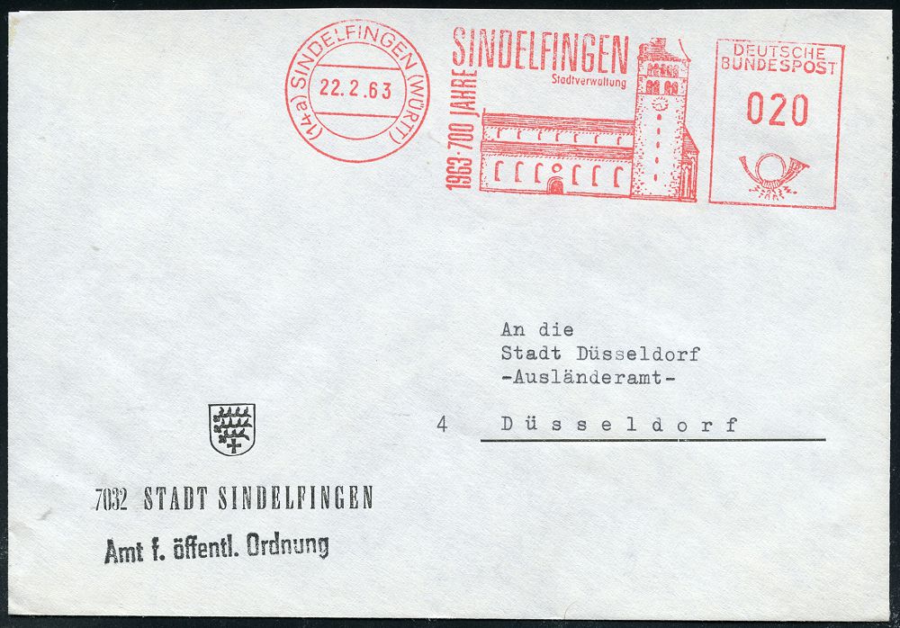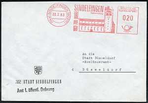 3888 | 14 € | POSTLEITRAUM 7000 (OHNE STUTTGART) : (14a) SINDELFINGEN (WÜRTT)/ 1963 700 JAHRE../ Stadtverwaltung 1963 (22.2.) Jubil.-AFS Francotyp (GRathaus) Kommunal-Bf. mit Abs.-1L: Amt f. öffentl. Ordnung (Dü.E-23) | ![]() | |