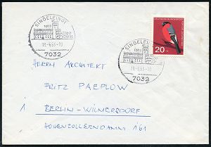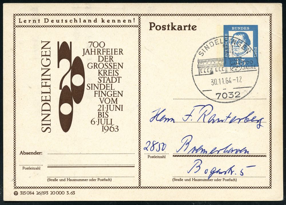 3890 | 15 € | POSTLEITRAUM 7000 (OHNE STUTTGART) : 7032 SINDELFINGEN/ 700/ JAHRE 1964 (30.11.) aptierter HWSt (Rathaus) Jahreszahl 1963 entfernt auf passender Jubil.-BiP 15 Pf. Luther: 700 JAHRFEIER SINDELFINGEN (Mi.P. 81) (Bo.4) | ![]() | |